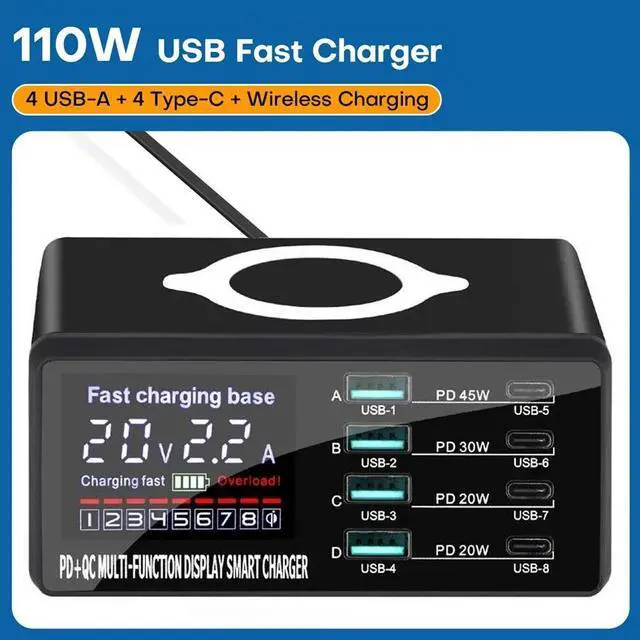 LCD Screen Dispaly USB Charging Station: The charging station includes wireless charging capability and a screen display for monitoring. This multi charging station keeps all your devices powered and organized, Making it one of the best chargers for multiple devices