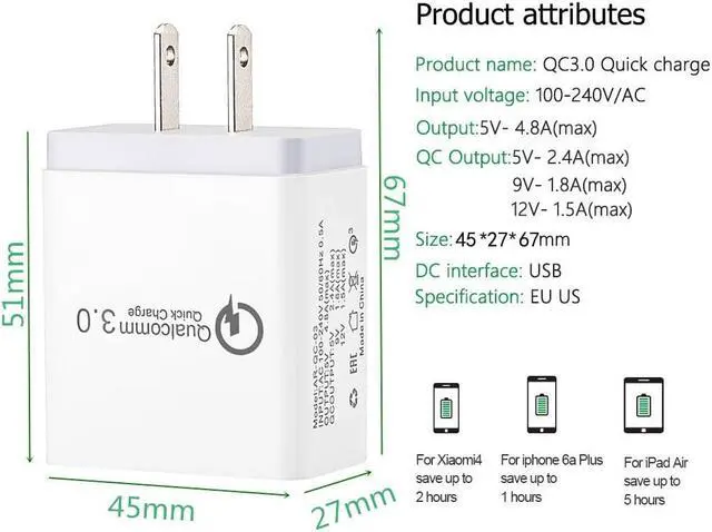Smart IC Technology Qualcomm Quick Charge QC 3.0 can automatic recognize any USB Support devices, 4 times faster than normal charger. When the cell phone battery is full, it will automatically stop charging. Save Your Time!
