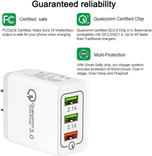 One Charger Boosts All 30W Fast Charger with one QC 3.0 and dual 2.1A charging ports, it provides a faster and steady charging speed with wide compatibility for all your devices. Triple usb port enables you to charge 3 devices simultaneous.
