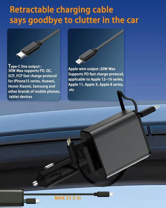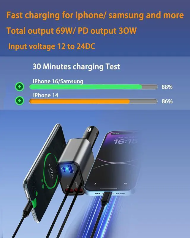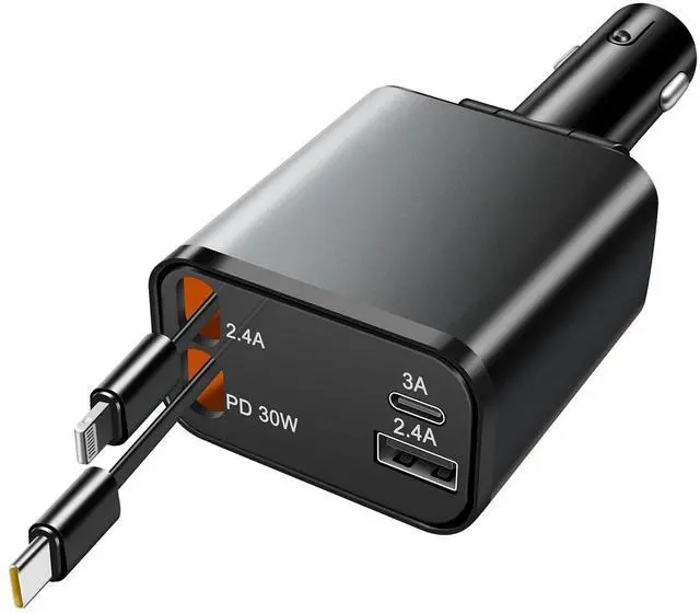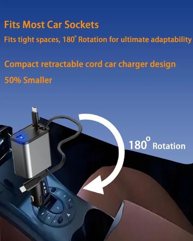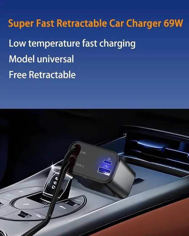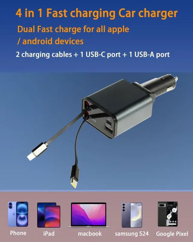 New 69W Car Fast Charger, 4-in-1 retractable car charger, USB C with retractable dual cable and 2 USB ports, men's gift, Car charger Type C adapter for iPhone 16/15/14/13/12 galaxy/pixel1pcs)