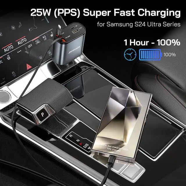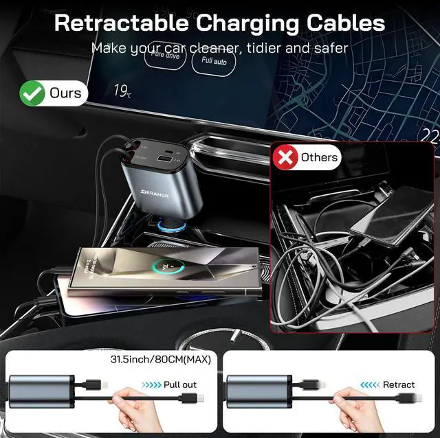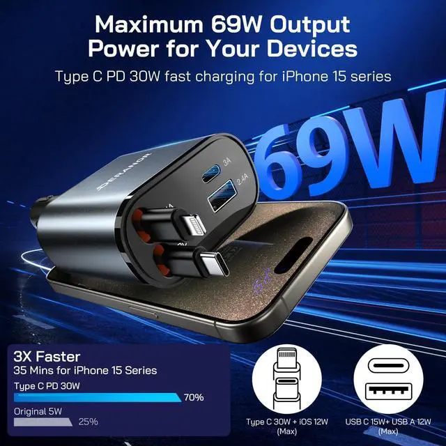 Come with 2 retractable cords that can be pulled out within the 80cm range. PD/PPS 30W Type C cable support Super Fast Charging for Samsung series, Fast charging for i Phone 15 series.