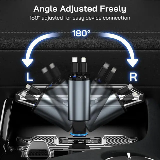 4 in 1 Car Charger with Retractable Cords [Type C + iOS] and Dual-Ports[USB A + USB C]