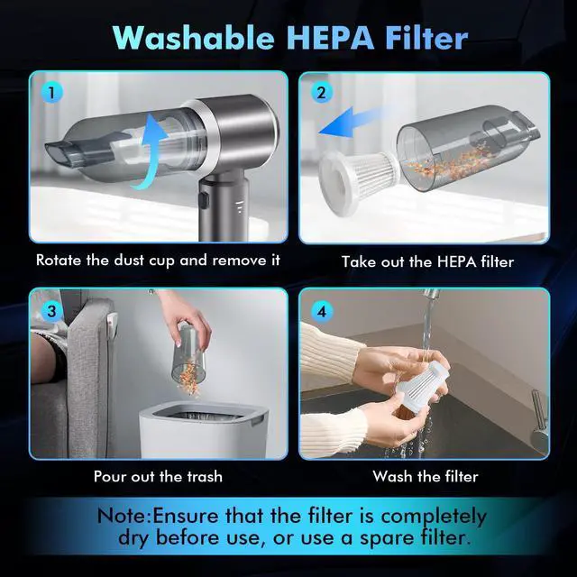 Discover the ultimate companion for maintaining a pristine and inviting car interior with our cordless car vacuum. Perfect for quick clean-ups on the go, this handheld vacuum is designed to effortlessly tackle crumbs, dust, and pet hair. The washable HEPA filter ensures that even the finest particles are captured, leaving your vehicle's interior air fresh and clean. Its dust container visualization feature offers a glance-assured confirmation of its contents, while the low noise operation means you can tidy up without disturbing passengers or the peace.The three-gear adjustable suction allows you to customize the power based on your cleaning needs -- from delicate upholstery to heavy-duty dirt extraction. Equipped with a high-efficiency brushless motor and powered by type-C charging technology, this portable vacuum cleaner recharges quickly and stays ready whenever needed. Whether you're keeping your car looking showroom-fresh or tackling unexpected spills, this mini vacuum cleaner is your go-to tool for impeccable cleanliness. Ideal for busy lifestyles, it easily stows away in small spaces, making it an essential part of your car accessories collection. This handheld vacuum is perfect for both men and women who value convenience and performance. A true multi-tasker, it also works wonders as a portable vacuum for car detailing kits and interior cleaners. For those who appreciate a well-maintained space, this cordless car vacuum offers exceptional results without the hassle of cords. Transform your driving experience with this versatile, compact, and efficient cleaning solution. Say goodbye to messes and hello to a spotless ride with every journey. Embrace the luxury of effortless maintenance with this indispensable accessory for your vehicle.