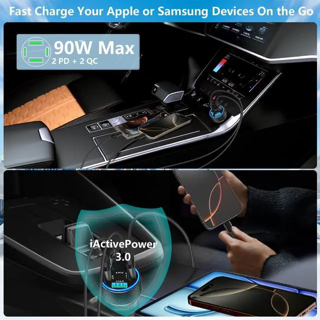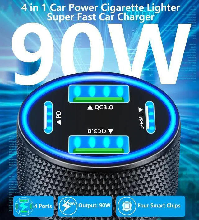 | Included Components | 90W Dual USB-C & USB-A Car Power Adapter 4-Port PD/QC Type C Fast Charging Cigarette Lighter Car Carplay Charger. |