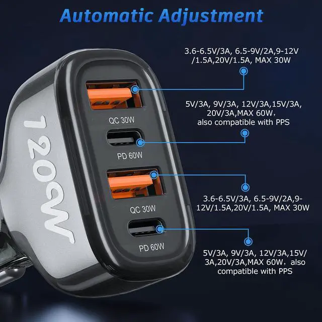 ![Alt view image 5 of 7 - 120W USB C Car Charger, 4 Ports Cigarette Lighter USB Car Charger Adapter, [2 PD 60W+2 QC3.0 30W] Fast Charging for iPhone 16 Pro Max Galaxy S23/22 Google Pixel LG iPad Air](https://c1.neweggimages.com/productimage/nb640/C3H4D25121707WPNF24.jpg)