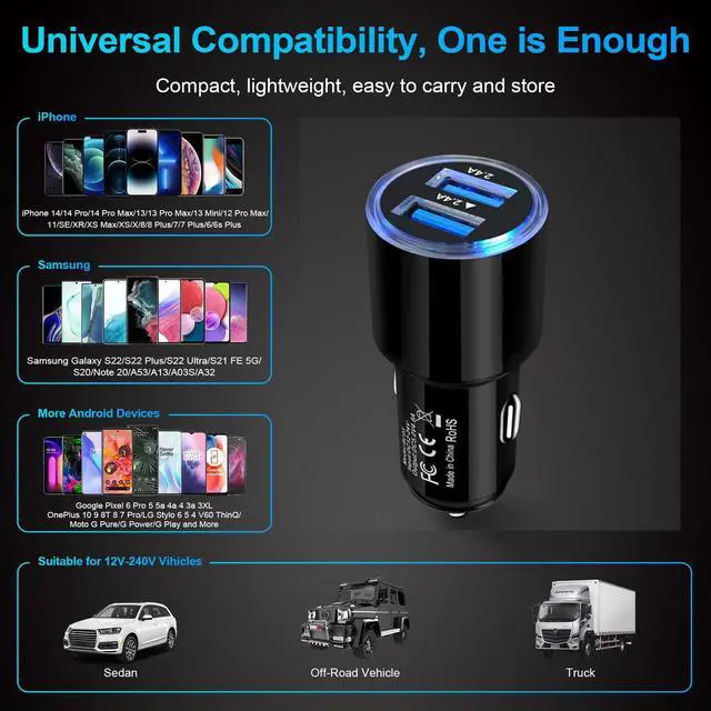 2-Port Design: Quick charge car charger is a practical auto accessory for charging two devices simultaneously, from iphone to android phones, tablets and more usb powered devices.