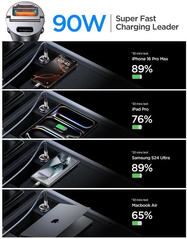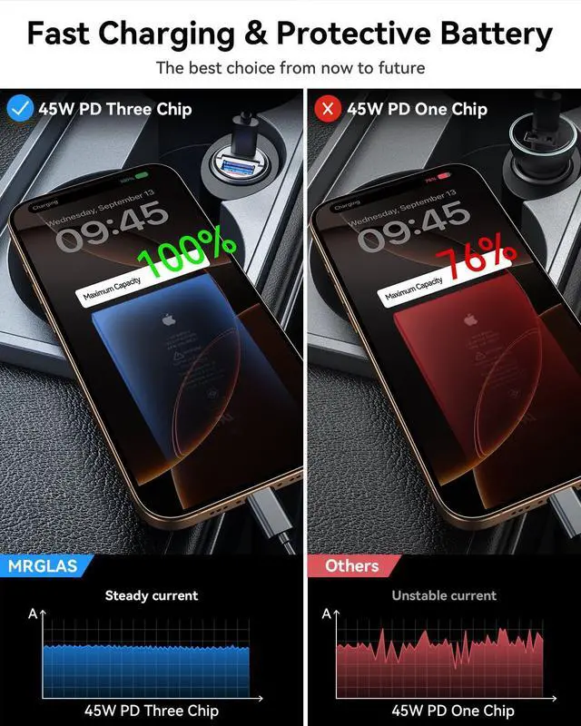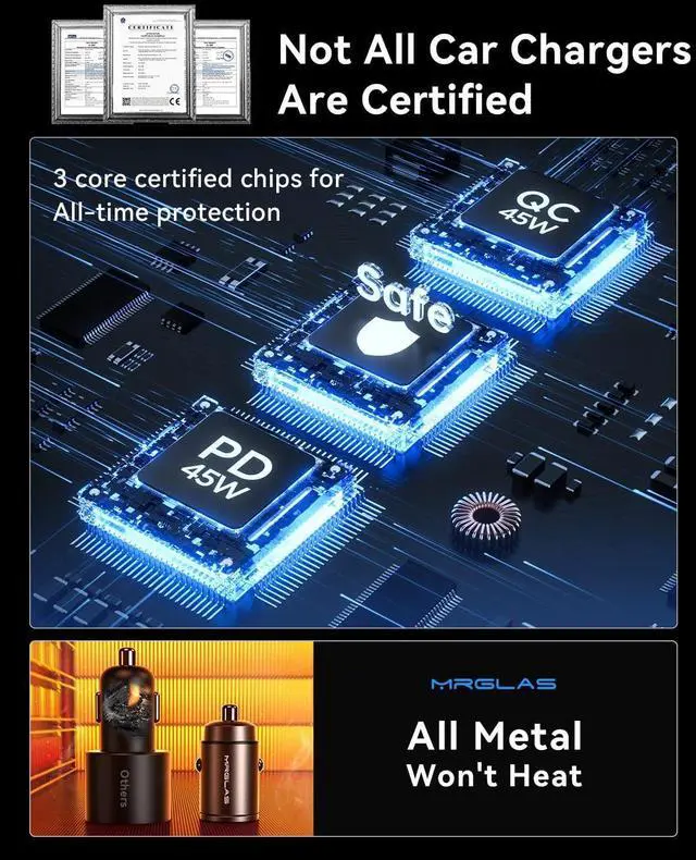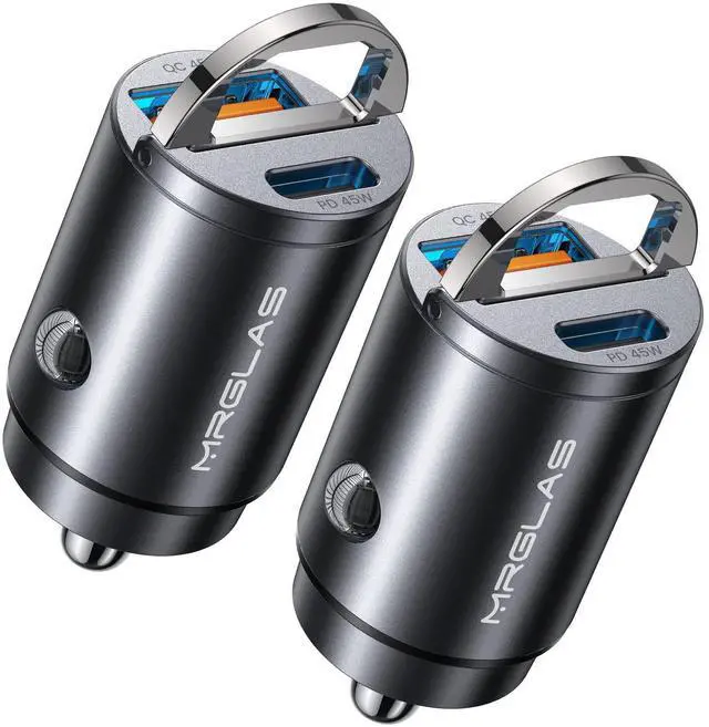 OFFICIALLY APPROVED 2-PACK 90W FAST CHARGING: MRGLAS 90W fast USB C car charger supporting PD 45W(usb-c port) and QC 45W(usb-a port) high output, can fast charge all prevailing phones/iPad/tablet at the same time. Makes the IPhone 16 Pro Max and Samsung Galaxy S24 charging time from 0% to 88% in 30 minutes. DUAL CHIPS INTELLIGENT POWER SUPPLY: Built-in PD45W&QC45W dual-core intelligent identification chip outputs 45W of fast charging current in each of its two cores, which is a safe and high-speed Fast Car Charger without damaging the device. THUMB-SIZED, PULL RING DESIGN: The smallest flawlessly car charger on the market until now. With a tiny-sized body, fits snug and flush into the lighter outlet does not protrude which perfectly hides in your cigarette lighters. Never popup while driving and won't block the cover of the cigarette lighter. So we designed a pull-ring to help you unplug from the car cigarette lighter easier.ALL ZINC ALLOY METAL PROTECTION: A all metal well-built body brings a very sleek sturdy feel compared with the usual plastic. Metal Material Provides better heat dissipation, scratch resistance, attractive design. With multiple safety certifications and a built-in smart IC, MRGLAS usb c car charger fast charge can prevent overcurrent, short circuit, over-voltage, under-voltage, over-temperature, and overpower to protect your device. WIDE COMPATIBILITY: USB C cigarette lighter adapter fast charger compatible with almost all popular car models and all Android/iOS and other devices like iPad/iPhone(45W), Samsung phone/tablet(45W), Fire HD, etc. Also work with car accessories like wireless car charger mount etc.