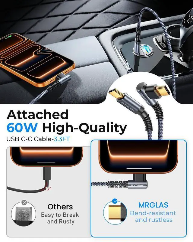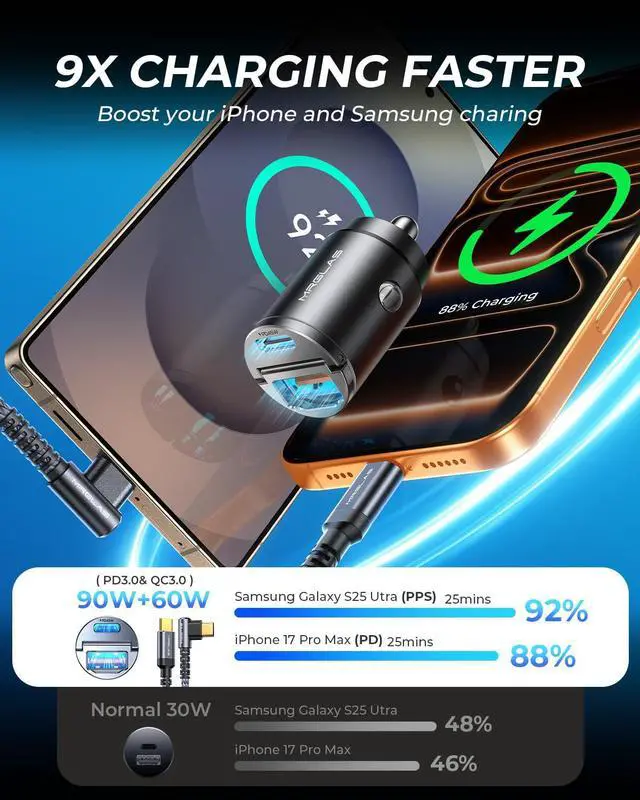 MRGLAS 90w USB c car charger fast charging, 6 times faster than 20W charger, 1.5 times faster than 54W charger.