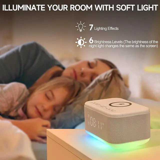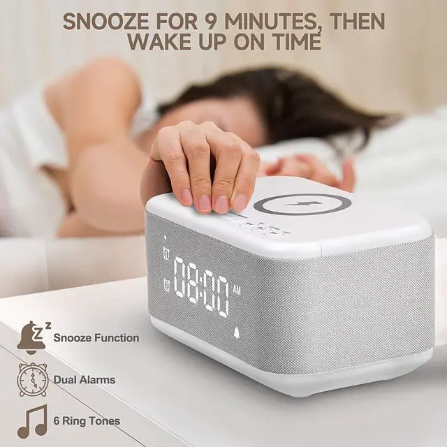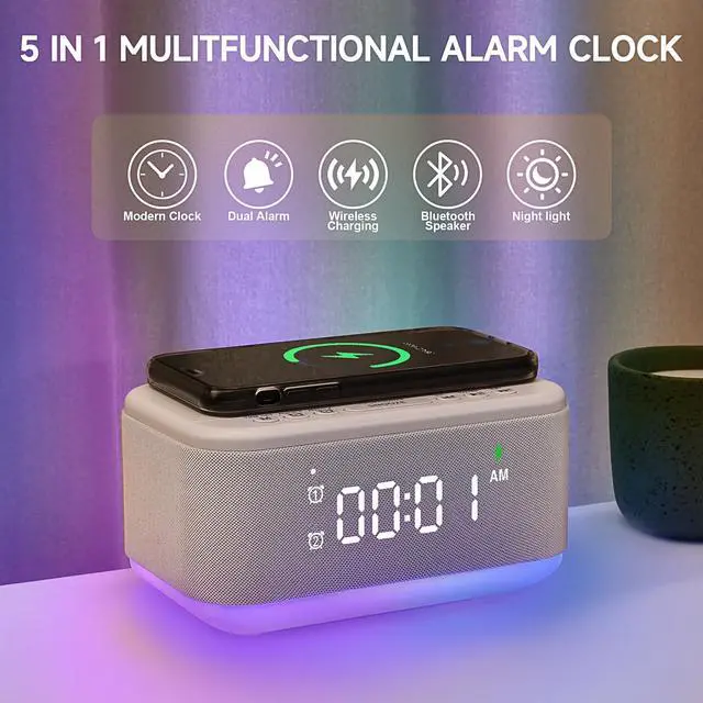 Alarm Clock Speaker Wireless Charger, Digital Alarm Clocks Bedrooms Bluetooth, Alarm Clock Dimmable Light Bedrooms Dual Alarm Snooze Dimmer 12 24H RGB Night Light Bluetooth USB AUX, White
