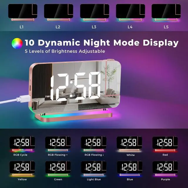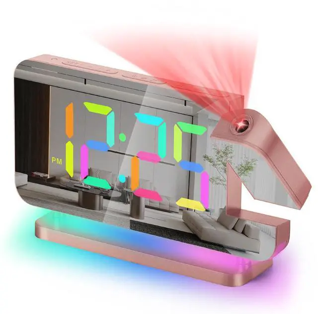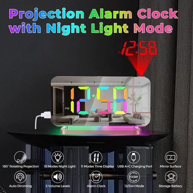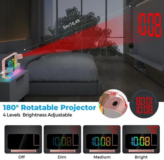 Hd Projection Alarm Clock The projection alarm clock can be rotated 180°, and the projection brightness can be adjusted in 4 levels.Led Rgb Colorful Clock The RGB alarm clock has 11 color display modes (4 dynamic modes + 7 fixed modes).