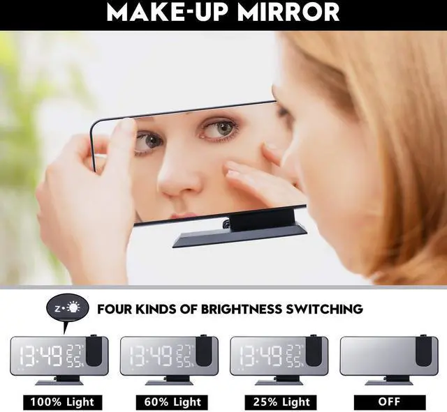 A: EVILTO projection clock is the latest mirror design, showing temperature and humidity as well, not only stylish and beautiful, but also a good partner for reporting the weather.