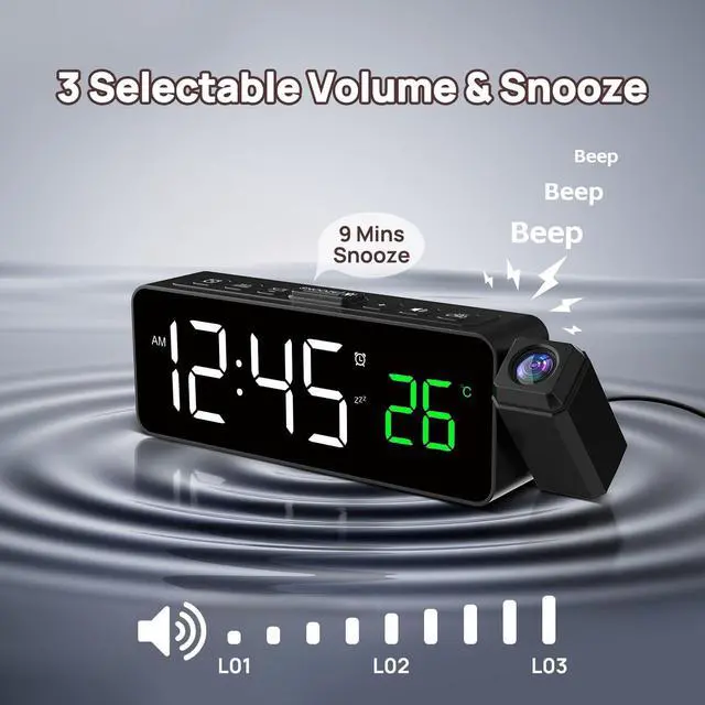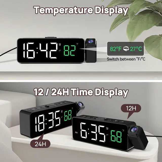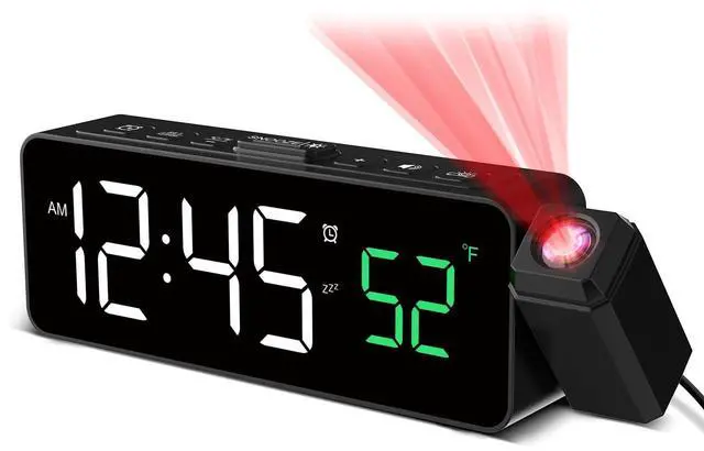 Elevate your morning routine with our Compact Projection Alarm Clock a space - saving marvel designed to simplify and enhance your daily life. This petite powerhouse packs a punch with a 180° rotatable projector, letting you cast time and temperature onto walls or ceilings within a 1.6ft - 11.4ft range. Whether youre cozy in bed or across the room, glance up for crystal - clear info. It displays and projects indoor temperature, keeping you in tune with your spaces climate. Customize brightness for both the projection and time display to match your mood dim for peaceful slumber, bright for sunny - morning clarity. Wake up gently or boldly with 3 adjustable volume levels, and hit snooze for that extra 9 - minute cushion. Powered by a simple plug - in design (battery backup for settings only), it ditches battery hassles. Perfect for bedrooms, dorms, or any space where function meets style start and end your days right, effortlessly.
