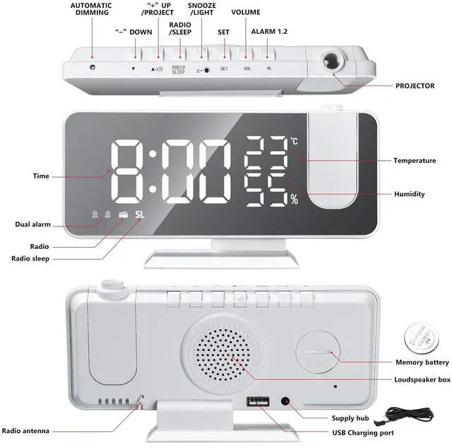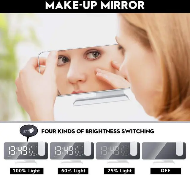 A: EVILTO projection clock is the latest mirror design, showing temperature and humidity as well, not only stylish and beautiful, but also a good partner for reporting the weather.