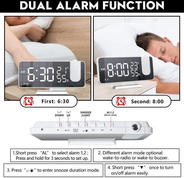 This alarm clock with dual alarms allows you to set two separate wake times if you and your family have different schedules, Alarm 1 or Alarm 2 as your preference.