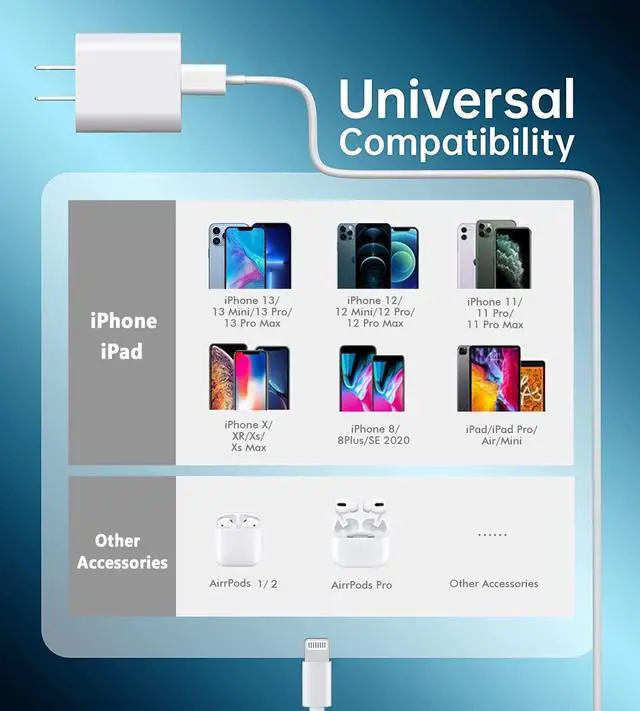 | Compatible Devices | Fast Charger for iPhone 14 / iPhone 14 Plus / iPhone 14 Pro / iPhone 14 Pro Max / /iPhone 13 / iPhone 13 Mini / iPhone 13 Pro / iPhone 13 Pro Max /iPhone12 / iPhone 12 Mini / iPhone 12 Pro / iPhone 12 Pro Max/iPhone 11 /11 Pro / Pro Max /iPhone X / iPhone XR / iPhone XS / iPhone XS Max / iPhone SE / iPhone SE 2020 / iPhone SE 2022 / iPhone 8 / iPhone 8 Plus / iPhone 7 / iPhone 7 Plus / iPhone 6 / iPhone 6 Plus / iPhone 6S / iPhone 6S Plus / iPhone 5 / 5S / 5C / AirPods 1 / AirPods 2 / AirPods Pro / AirPods Max / iPad Pro 12.9" 1st / iPad Pro 12.9" 2nd / iPad Pro 10.5" / iPad Pro 9.7" / iPad Air 1 / iPad Air 2 / iPad Air 3 / iPad Mini 1 / 2 / 3 / 4 / 5 / iPad 5 / 6 / 7 / 8 / 9 And Later Devices. |