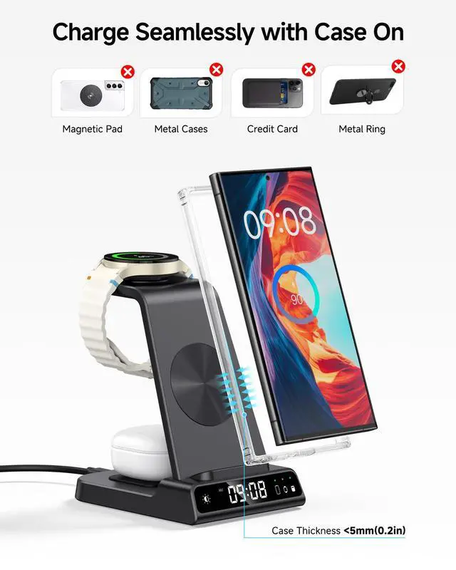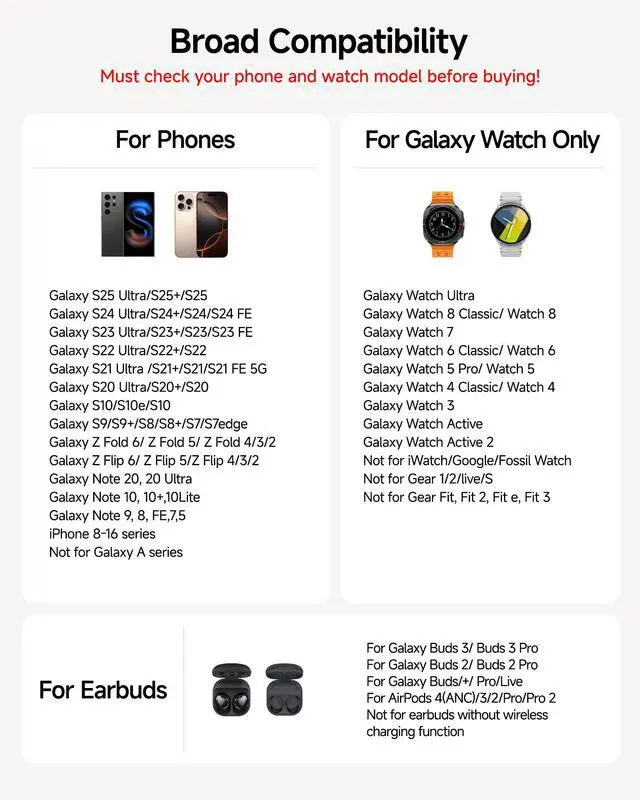 Wide Compatibility - The watch charging area is specifically designed for Samsung Galaxy Watch Ultra/8/8 Classic/7/6/6 Classic/5/5 Pro/4/4 Classic/3/Active 1/2. The phone and earbud charging areas support all wireless charging phones and earbuds, compatible with S25 Ultra/S25+/S25/S24 Ultra/S24+/S24/S23/S22/S10/Note 20/Z Flip7/Z Fold6 and iPhone 16 series, as well as Galaxy Buds series. (Note: Not for Apple Watch)