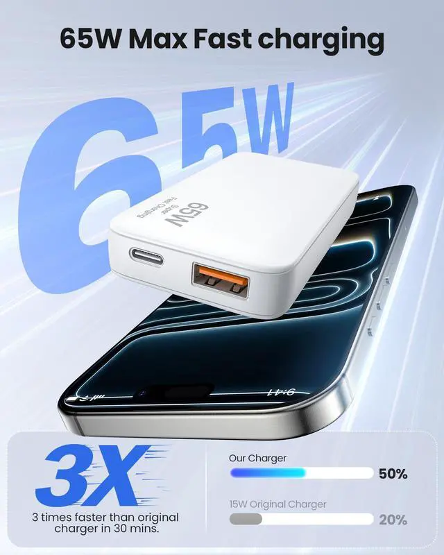 65W Fast Charging: This flat charging block features USB-C and USB-A ports with a total power output of up to 65W, with the USB-C port supporting a maximum power output of 65W. The USB-C charging block provides a fast and efficient charging experience, charging your iPhone from 0% to 50% in just 30 minutes.