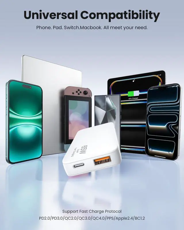 Lightweight and Portable: This 65W charger features a popular ultra-thin design, measuring just 0.57 inches thick, and comes with a foldable plug, making it the perfect companion and portable charger for your travels. Its flat wall-mounted construction is compact in size, easily fitting into your pocket, backpack, or small spaces. Whether you're at home, in the office, or on the go, this charger allows you to enjoy convenient charging anytime, anywhere.