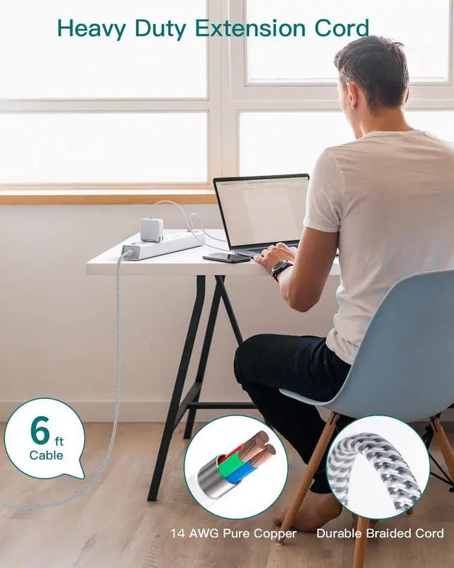 Ultra Thin Flat Plug & 5ft Heavy Duty Power Cord - With only 0.35-inch flat wall plug and 45-degree right angle design, this flat outlet extension cord is much thinner than traditional plugs. Flat plug power strip can close to the wall easily and hide in the back of furniture, bed or refrigerators, save every space for your home. 6-foot extension cord offers flexibility and allows you to easily reach distant power outlets, making it ideal for home, office, school, dorm room to use.