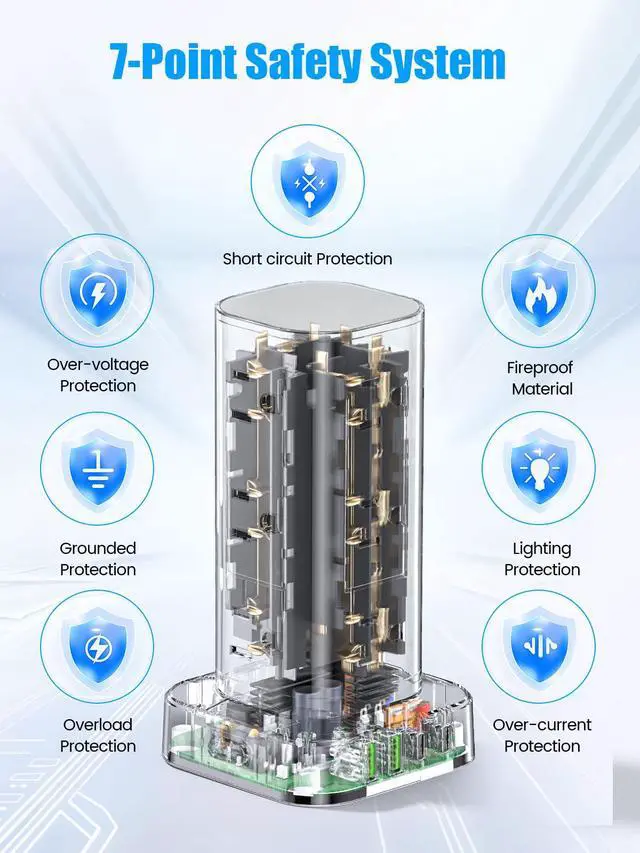 This incredible power tower contains a 1800J internal surge protector that will automatically shut down in the event of an overwhelming surge (spike/lightning). The overload protector also closes in the event of overheating, overcurrent or short circuit. All you have to do is press the reset switch on the side to turn it back on!