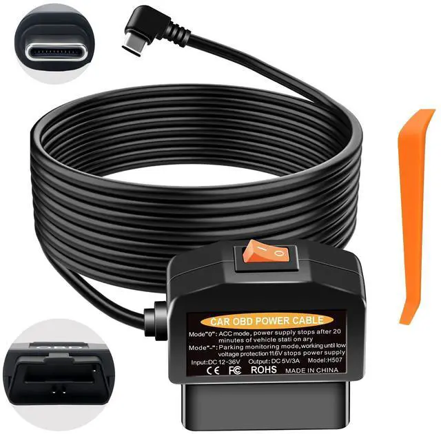 dash cam power cable USB C ,OBD to Type-C Adapter Hardwire Kit with 24/7 Parking Mode, Low Voltage Protection (11.6V/23.4V) with 2 Modes Switch , Acc Detection, Plug and Play Continuous Recording
