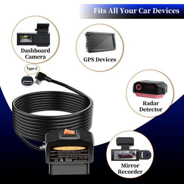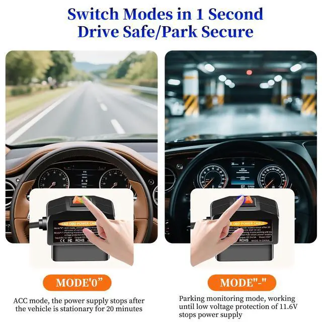 Smart Dual-Mode Switch for Dash Cam Toggle the physical switch to choose between: Daily Mode 0 (auto power-off ~20 minutes after engine shut-off) and 24/7 Surveillance Mode - (continuous parking monitoring). A versatile OBD2 power adapter for dash cam.