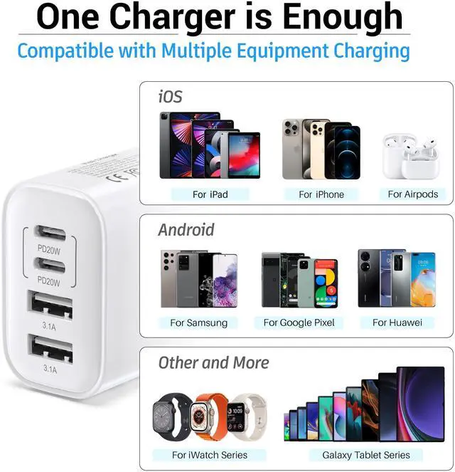 High-Powered Efficiency: With a total power output of 40W, this charger ensures rapid charging for up to four devices simultaneously. Each USB-C port delivers up to 20W power, perfect for fast-charging smartphones, tablets, and even some laptops. The USB-A ports provide up to 3.1A each, accommodating a wide range of devices including Bluetooth headphones, smartwatches, and more.