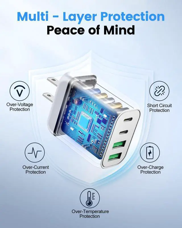Multiple Safety ProtectionThe type c charger is built with an advanced safety system that includes Over-Voltage Protection, Over-Current Protection, Over-Temperature Protection, Over-Charge Protection, and Short Circuit Protection. Whether you're charging a phone, tablet, or any USB-powered device, this usb c charger block ensures stable, secure, and worry-free performance for all your charging needs.