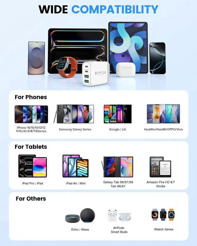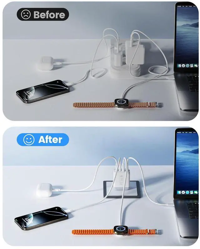 4-Port Fast Charging BlockDesigned with two USB-C and two USB-A ports, this usb charger block lets you power multiple deviceslike your phone, tablet, and wireless earbudsat the same time, eliminating the need to wait for one to finish charging. No more carrying multiple bulky adaptersthis space-saving usbc charger brings convenience, speed, and portability wherever you are.