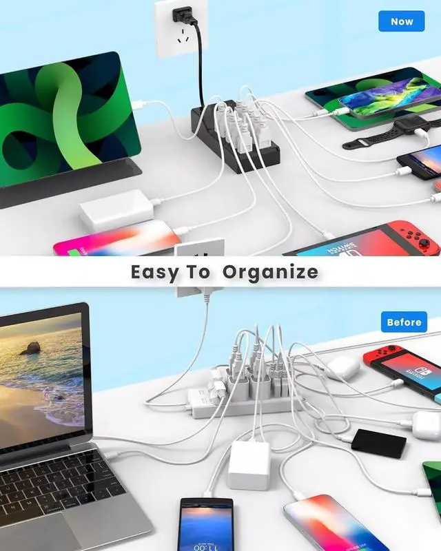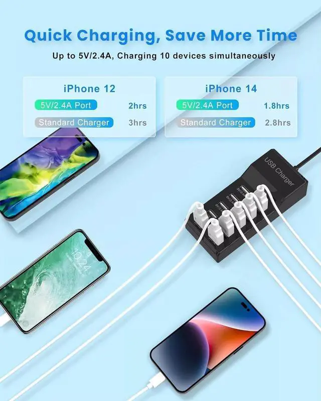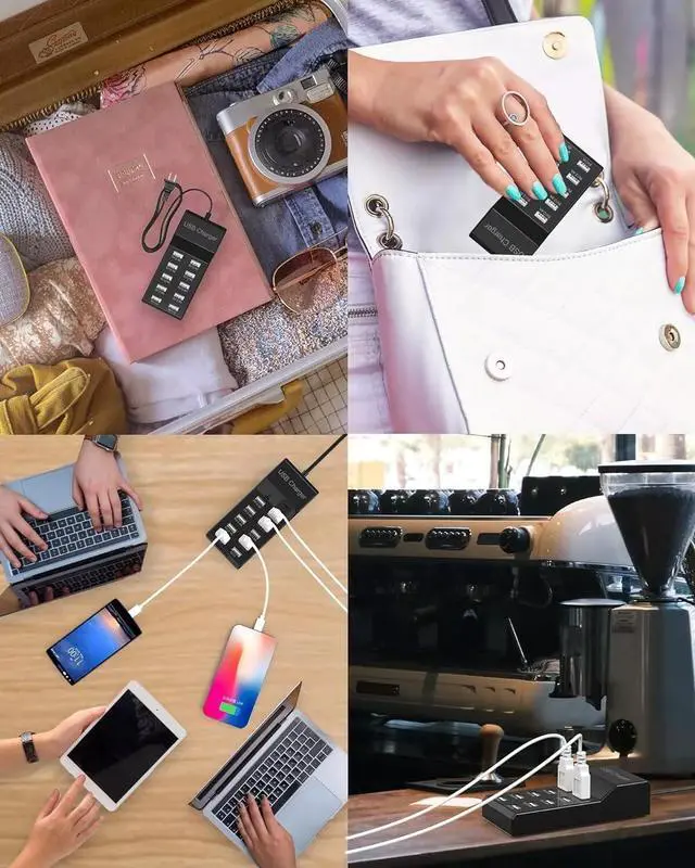 10-IN-1 Fast Charger : This charger has 10 USB-A, and you can charge 10 devices at the same time. This charger has 10 USB-A and you can charge up to 10 devices at the same time with a multi-port adapter to charge your smartphone or desk. Small size saves you more space