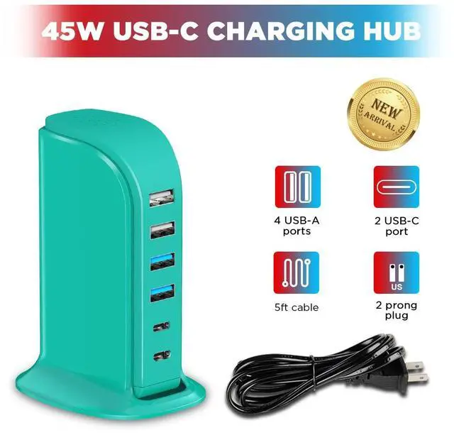 4 USB-A + 2 USB-C fast charging ports, 5V-8A, 45W charger adapter, compatible with most kinds of electronic gadgets.