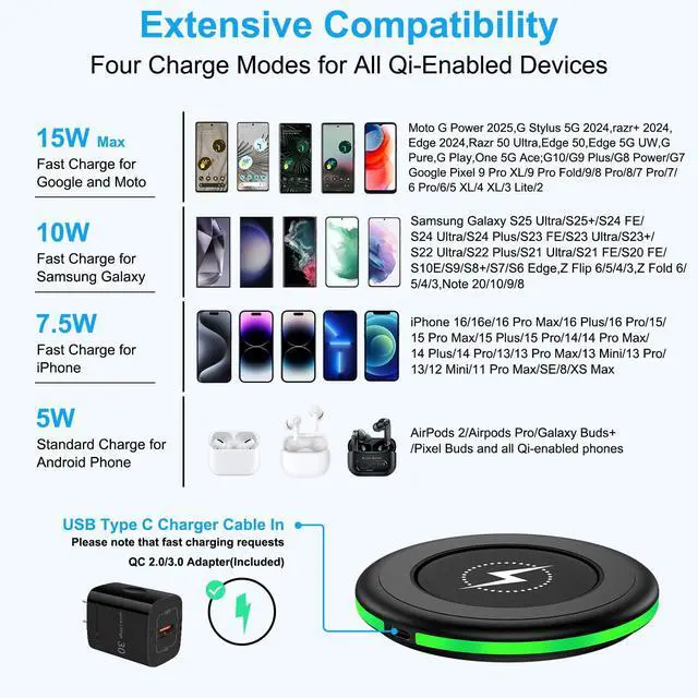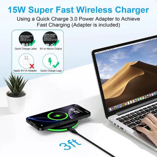 15W Wireless Charger Samsung Fast Charging Pad Android Phone Wireless Charging Station Mat with Quick Charge 3.0 Adapter+3FT USB Type C Charger Cable
