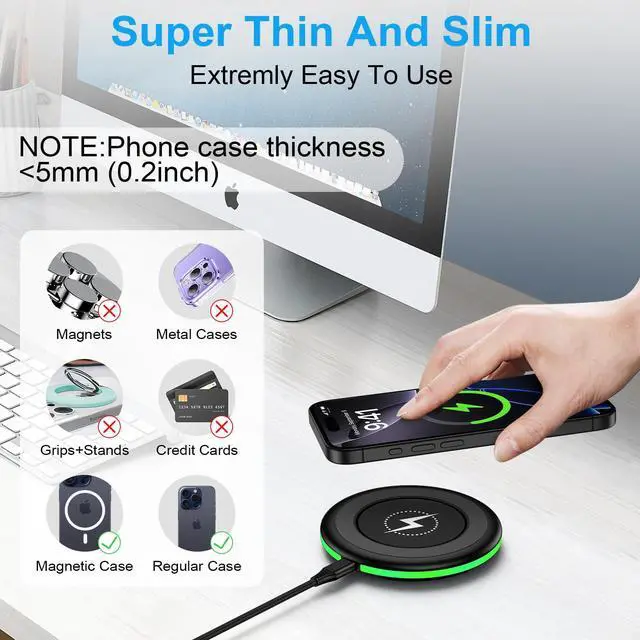 Phone cases (thickness less than 5mm) such as Rubber,Ultra Hybrid,Plastic,TPU,PC etc; Metal, magnetic objects or credit cards will interfere the charging process, please remove them before charging.