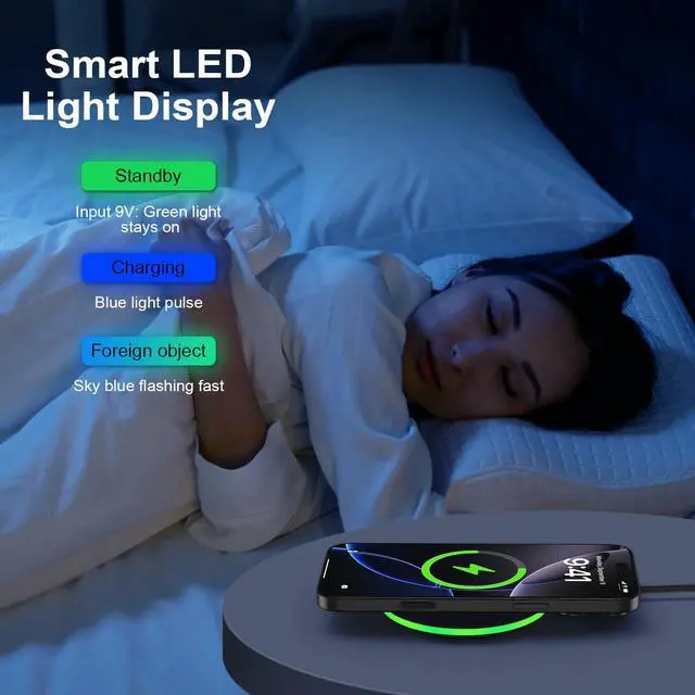 The wireless charger pad built-in smart chip, it can automatically detect the best charging speed for your phones. Multiple intelligent security protections to keep you and your devices safe.
