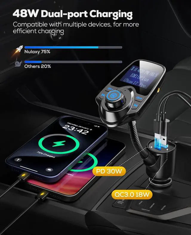 Dual Fast-Charging Ports for Simultaneous Multi-Device Charging: The Nulaxy KM18 Plus features an upgraded Type-C PD 30W charging port, paired with the original USB QC3.0 port. It supports simultaneous high-speed charging for two devices (e.g., smartphones, tablets), with charging efficiency far exceeding that of standard ports. You can flexibly select the appropriate port based on your device needs, ensuring fast power replenishment during your drives.