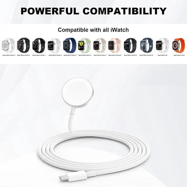 Compatible Apple Watch Models: This charging cable works with Apple Watch Series 1, Apple Watch Series 2, Apple Watch Series 3, Apple Watch Series 4, Apple Watch Series 5, Apple Watch Series 6, Apple Watch Series 7, Apple Watch Series 8, Apple Watch Series 9, Apple Watch SE, Apple Watch Ultra, Apple Watch Sport, Apple Watch Hermès, and Apple Watch Edition. It fits all case sizes including 38mm, 40mm, 41mm, 42mm, 44mm, and 45mm versions.