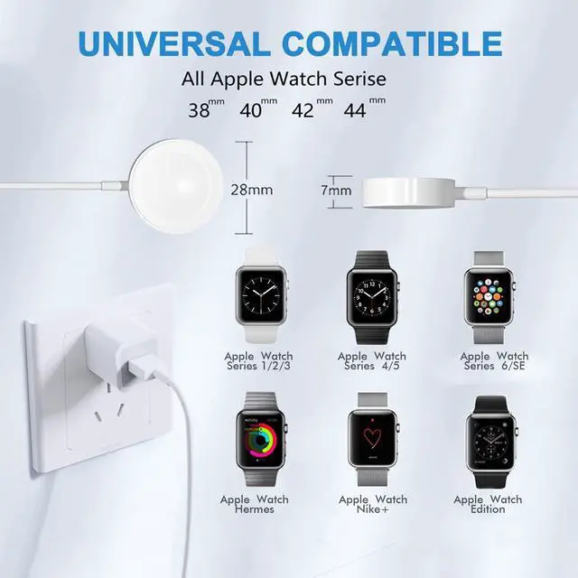 The watch charger is compatible for all 44mm 42mm 40mm 38mm Apple Watch version; Apple Watch SeriesSE 6 5 4 3 2 1, Apple Watch Sport, Apple Watch Nike, Apple Watch Hermès, Apple Watch Edition.