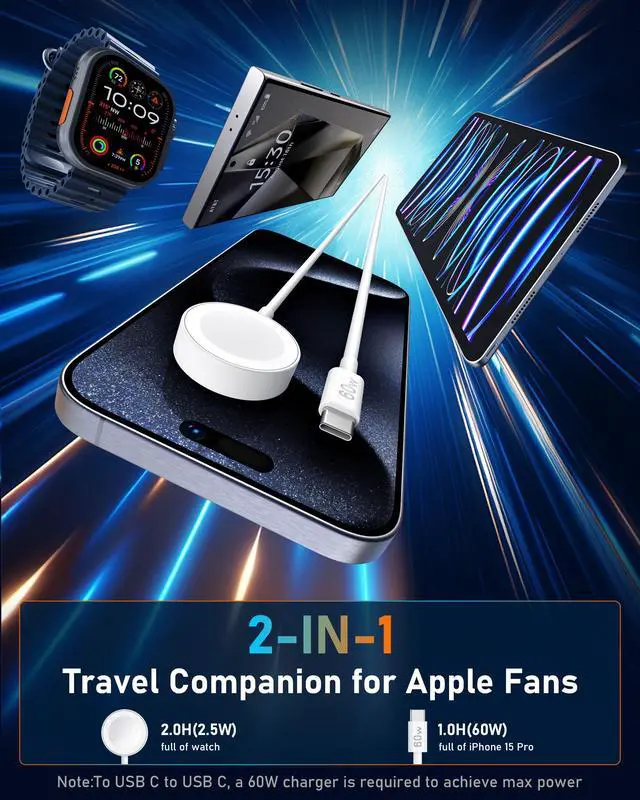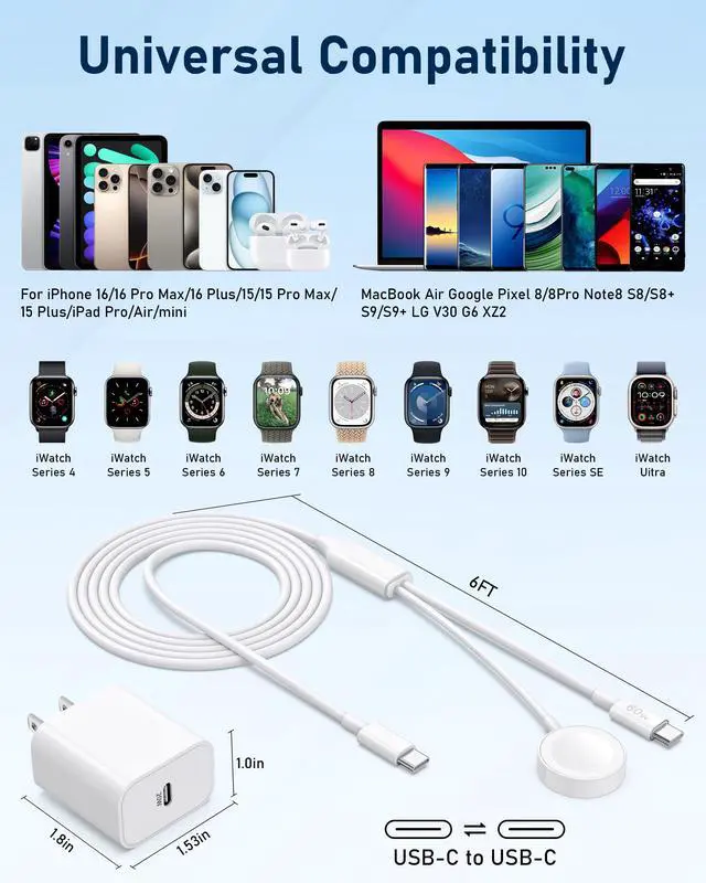 Wide CompatibilityThe USB C Ports Support Fast Charging Compatible with iPhone 17/17 Pro max/17 Pro/17 Air,iPhone 16/16 Pro max/16 Pro/16 Plus,15/15 Pro max/15Pro/15 Plus, for iPad Pro/iPad Air/iPad mini 6th/iPad 10th Gen, MacBook Air 13/12 inch M1/M2, 2022 2020 2019 2018 Laptop, compatible with all watch series Ultra/SE/10/9/8/7/6/5/4/3/2/1(including 38mm/40mm/42mm/44mm/45mm watch models).