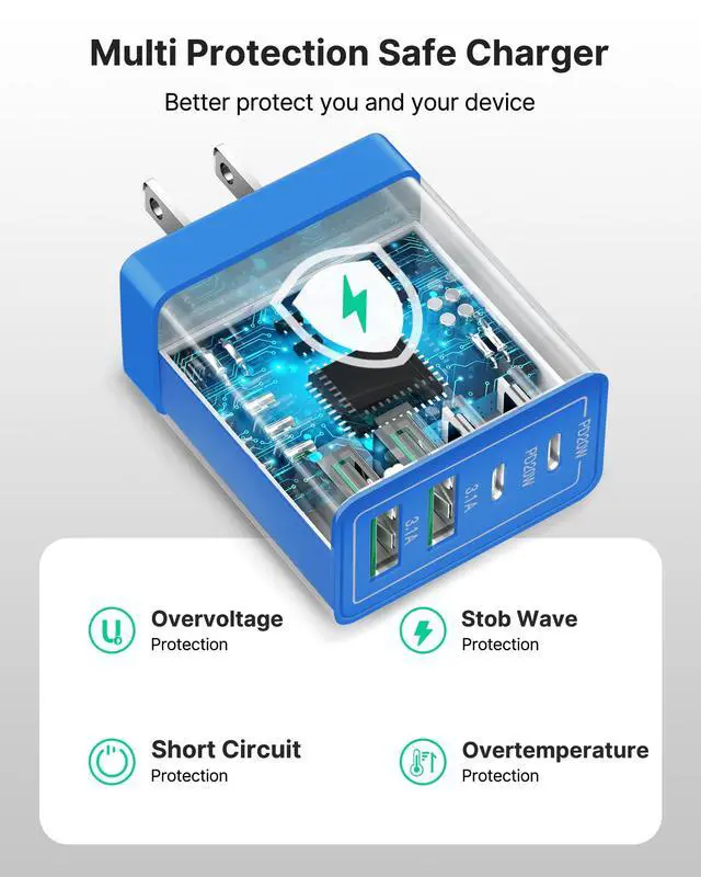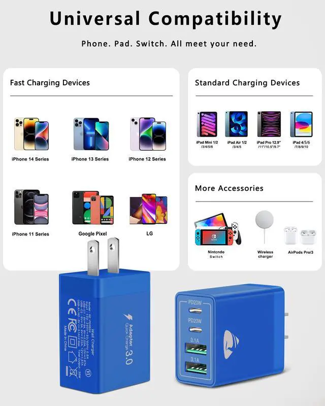 Universal Compatibility:Due to the special 4-port,the USB charger is compatible with almost all electronic devices,charging adapter for iPhone 15/15 Pro/15 Pro Max/14/14 Pro/14 Pro Max/13/13 Mini/13 Pro Max/12/12 Pro Max/12 Pro Max/12 Mini/SE 2020/11/11 Pro/11 Pro Max/XR/XS/X/8/7,iPad Air/Pro/Mini,Samsung Galaxy S22/S21/S20/S10/S9/S8/A12/A13/A22/A32/A52/A53/A71/Note 20 10,Tablets,LG,Google Pixel and other digital devices