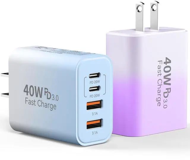 USB C Charger Block, 2Pack 40W 4 Ports Type C Fast Phone Charging Cubes PD USBC Wall Plug+QC 3.0 USB A Charger Power Brick Box for iPhone 16/15/14/13/12/11 Pro Max, Galaxy,Gradient Purple+Blue