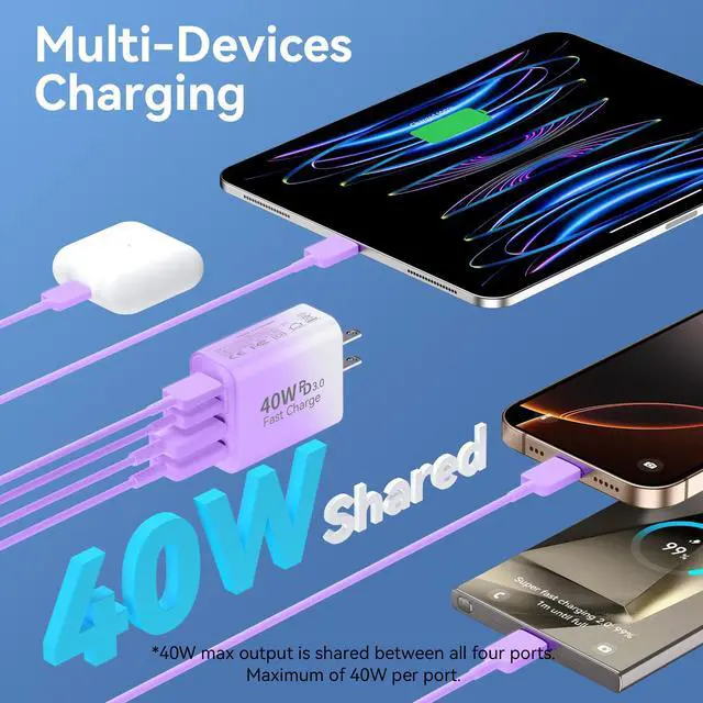 High Speed Charging for 4 DevicesWith 2 USB-C ports and 2 USB-A ports, effortlessly charge your cell phone, tablet, and earphone all at once from a single charger. Connect a single device to charge up to 40W. All this power comes installed in a pocket-friendly compact body, to go wherever the journey takes you. Ideal for home, office, and on-the-go.
