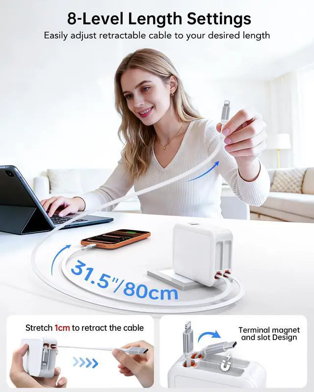 Dual 80cm Retractable Cable Charger:The maximum retractable length of the iphone charging cable is 80cm (31.50 inches), and it can be adjusted in 8 levels to meet different length requirements.After unplugging, all it takes is a gentle 1cm pull to retract the cable, eliminating clutter and tangles for good.And the charging cable Tested 10000 times under 1kg tension, the product is reliable, and durable.Note: Avoid inverted insertion into wall outlets!