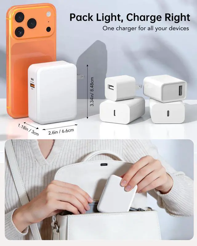 Travel Essentials iPhone Charger: This portable charger block measures 3.3 x 2 .6x 1.1 inches and weighs 4.62 ounces.Its ultra-compact design, complete with rounded edges, retractable cables, and foldable plug, making it 30% smaller than other 4-port retractable chargers and prevents scratches on other items in your bag.Due to compact body design,the fast charging becomes a trip essentials and perfect as an ideal companion for travel, office or home.
