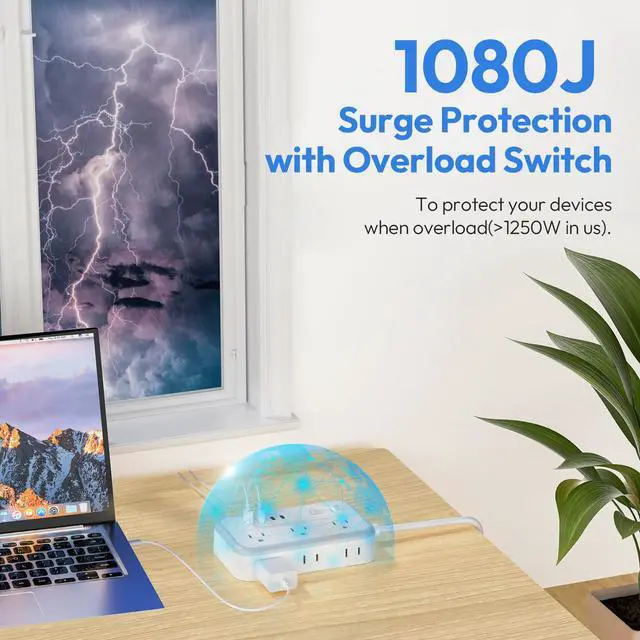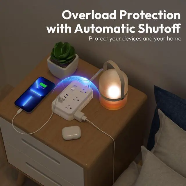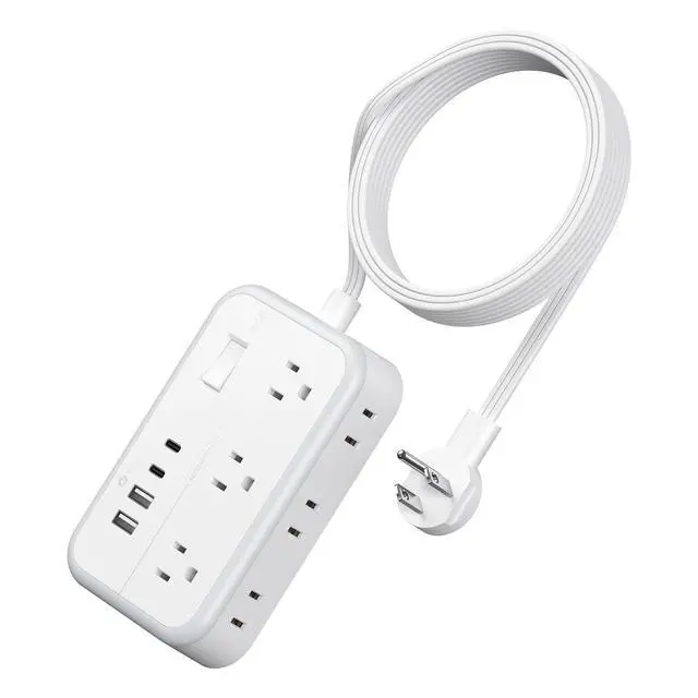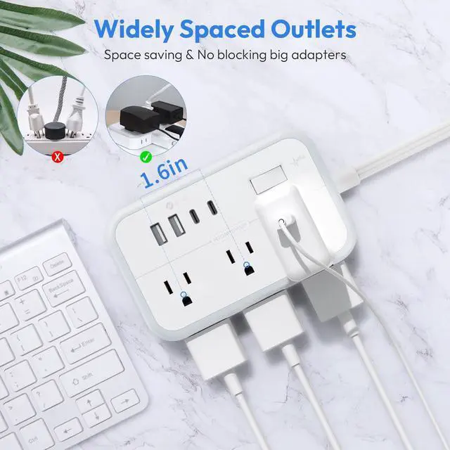 This flat power strip can support 10 devices simultaneously. Simple design and compact size, ideal for tabletop or bedside for home, office and Dorm Room.
