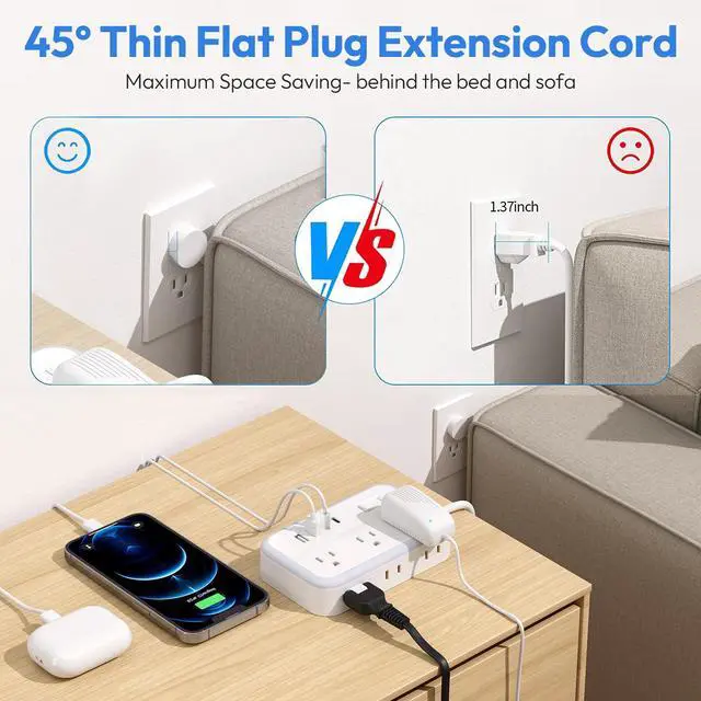 - 45° angled plug doesn’t block the bottom receptacle. The flat plug features a low profile(0.75in) fits easily in tight spaces like behind furniture, bookshelves, desks.