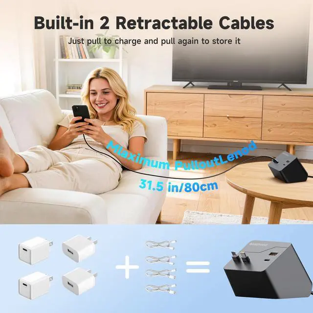 [80CM Maximum Retractable Charging Cables] This retractable chargers for multiple devices comes with two 31.5 in (80cm) long retractable charging cables.The retractable phone charger maximum retractable length of the charging cables is 80cm,perfect for charging iphone,Android phones or tablets with USB-C ports