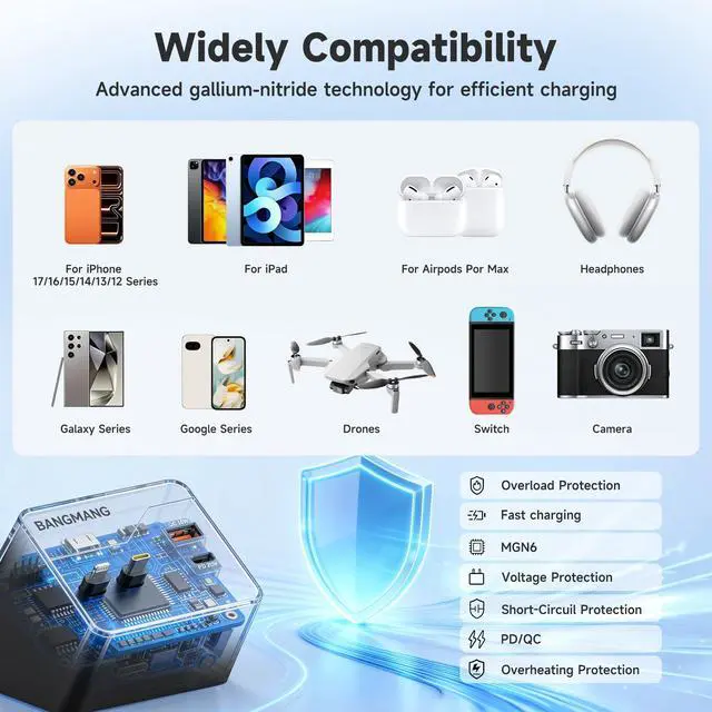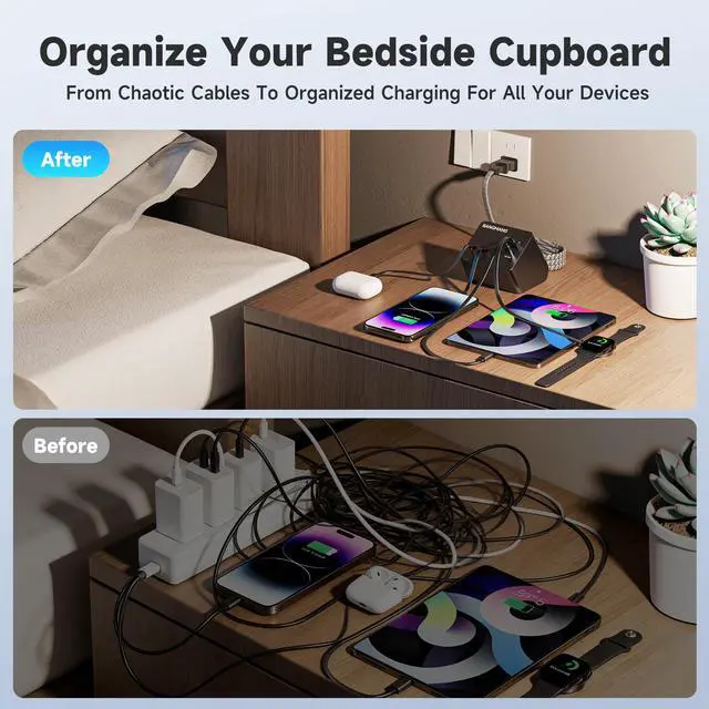 [4-in-1 Charging Station for Multiple Devices] This powerful retractable charging station features two retractable cables (USB-C 20W and Apple 20W), one USB-C PD 20W and one USB-A QC 18W port. BANGMANG retractable charger can charge mobile phones, headphones, tablets and other devices simultaneously, and supports fast charging of up to 4 devices at the same time, meeting all your charging needs. It is an essential choice for home, office and travel