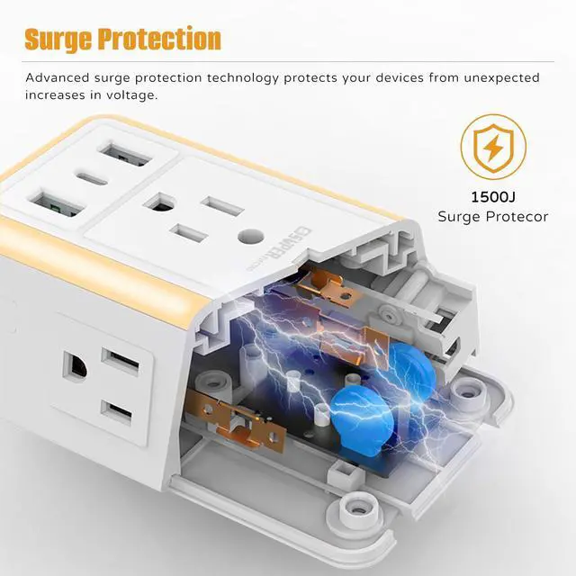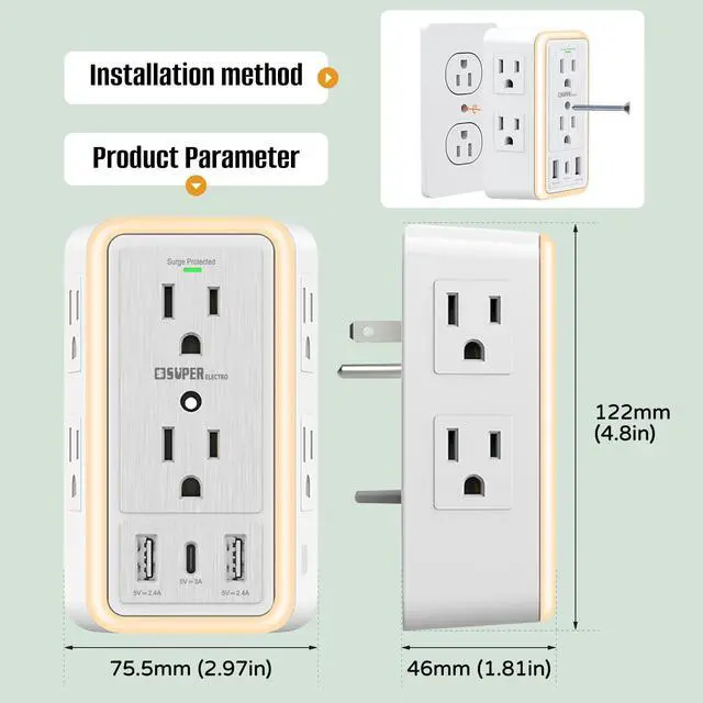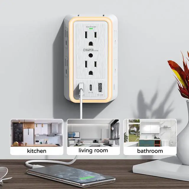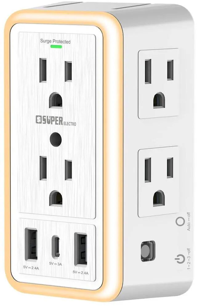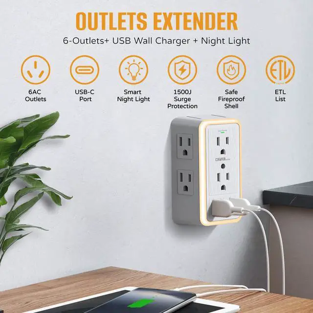 This multi-functional USB outlet wall charger expands 1 outlet to 6 AC outlets, 2 smart USB charging ports and 1 USB-C port which allow you to power up to 9 devices simultaneously.