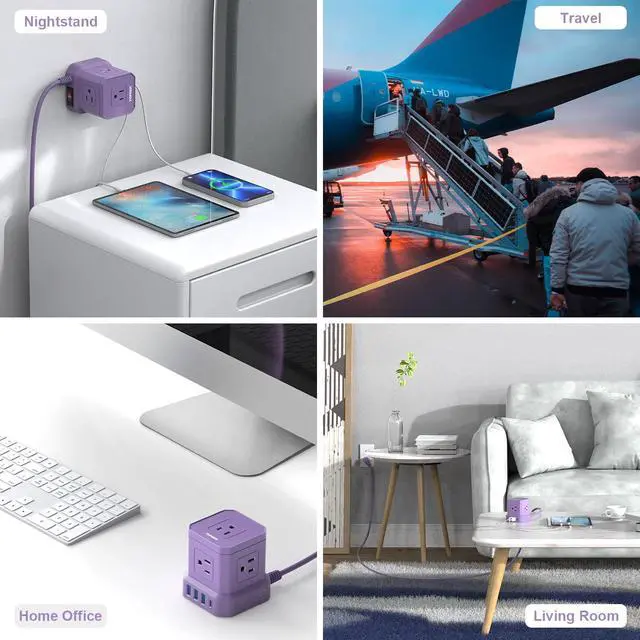 This power strip with USB ports is really convenient as it is small but has 5 AC outlets, 1 type-C and 3 USB-A ports, useful to keep organized all devices on your desk. It features a mini cubic size (3.11*3.11*3.27 inches), fit well in your luggage.