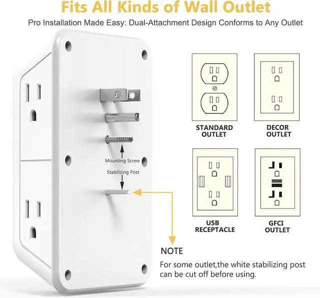 6 AC outlets built-in 1050 Joules surge protector with 2.1 inches long space in between, larger than standard 1.5-inch socket. Larger spacing makes it easier to use for all kinds of equipment. 4 Smart USB ports 2.4A can charge your smart device quickly.Ideal room/home/bedroom and so on.